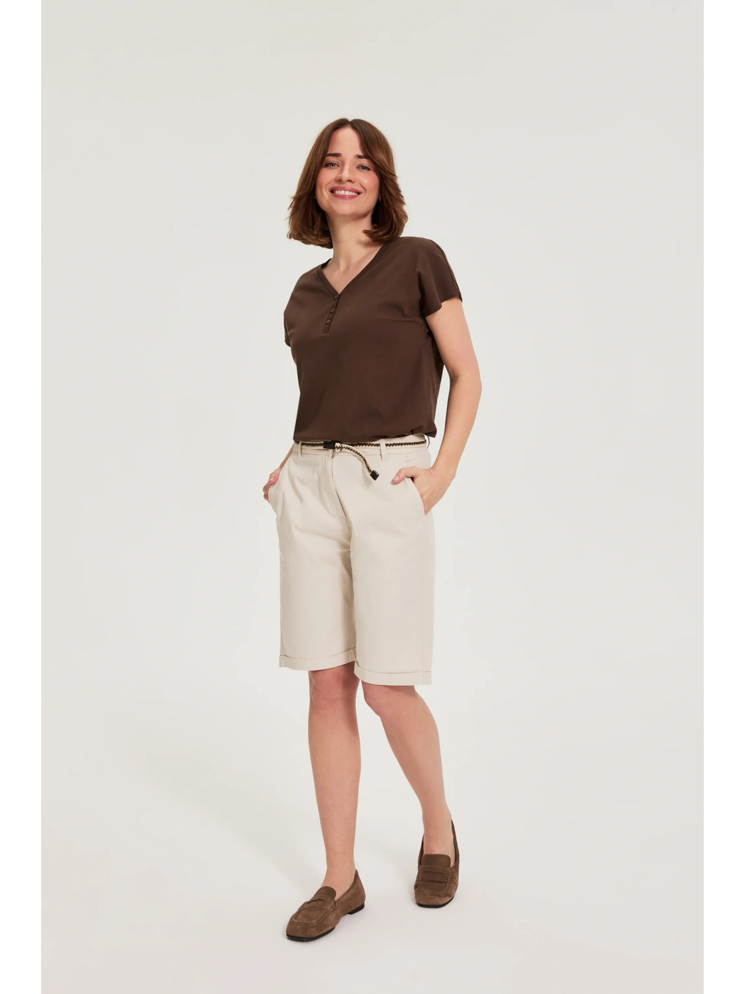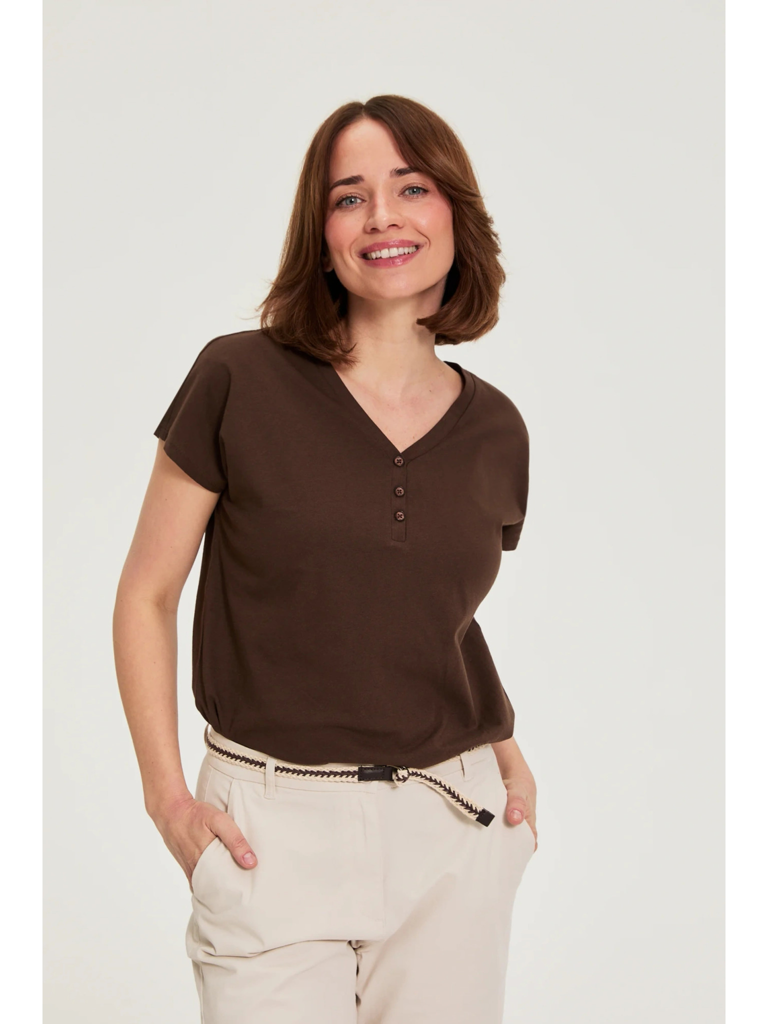 Памучна блуза с V-образно деколте в бежово Moodo