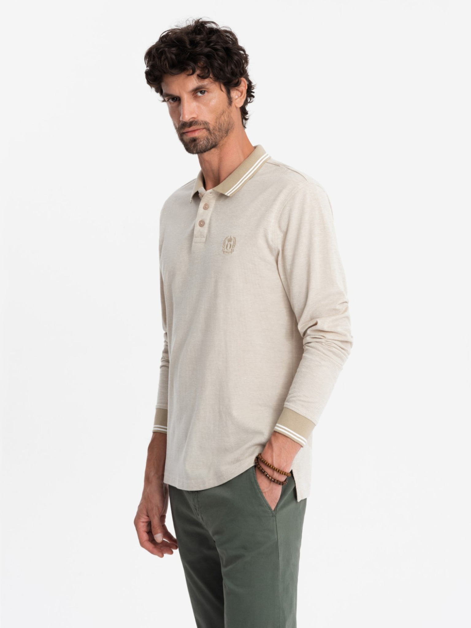 Мъжка поло блуза с дълъг ръкав и бродирана щампа Ombre Clothing