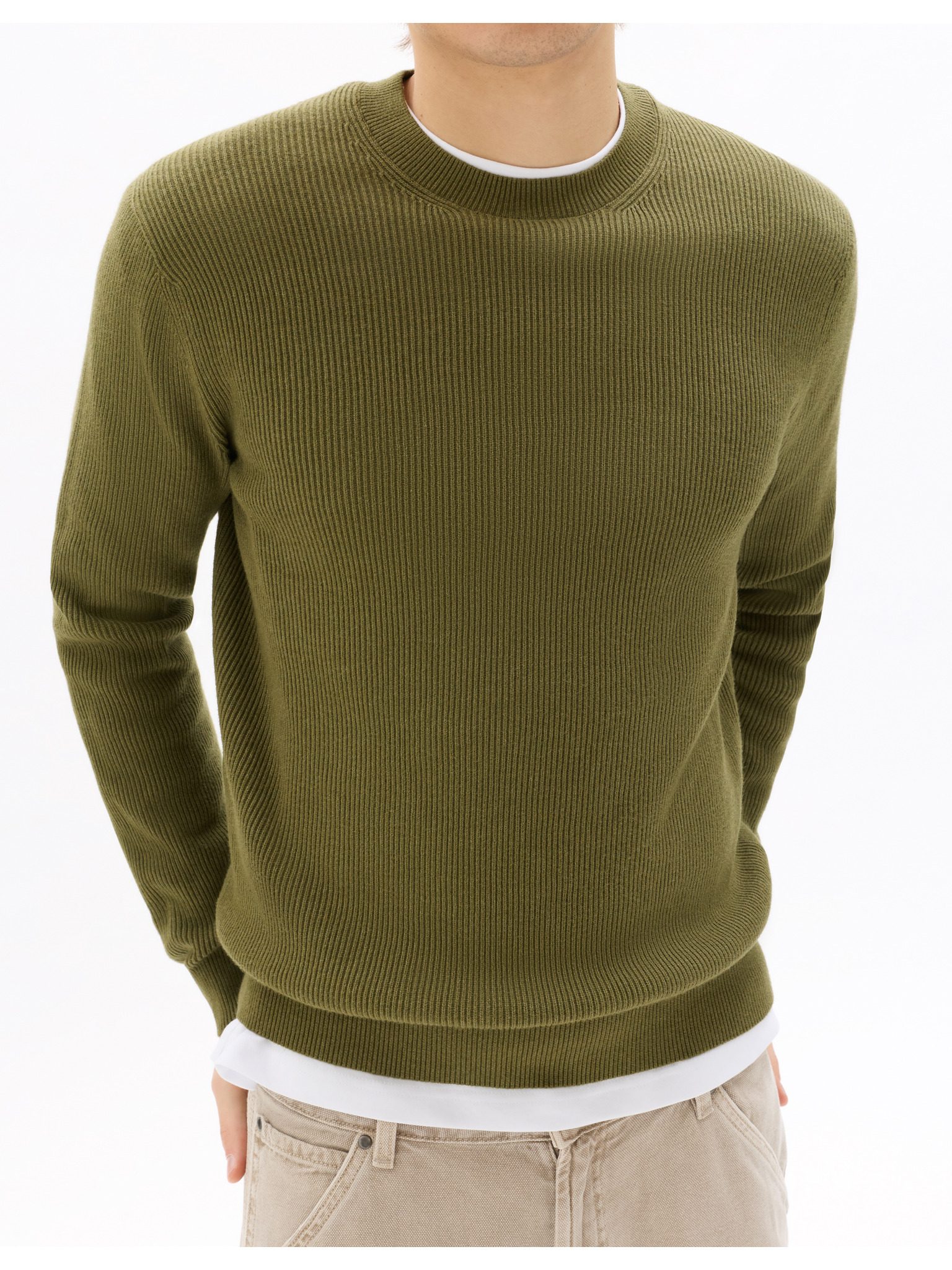 Мъжки вискозен пуловер BASIC classic с кръгло деколте - маслинов меланж V17 OM-SWBS-0106 Ombre Clothing