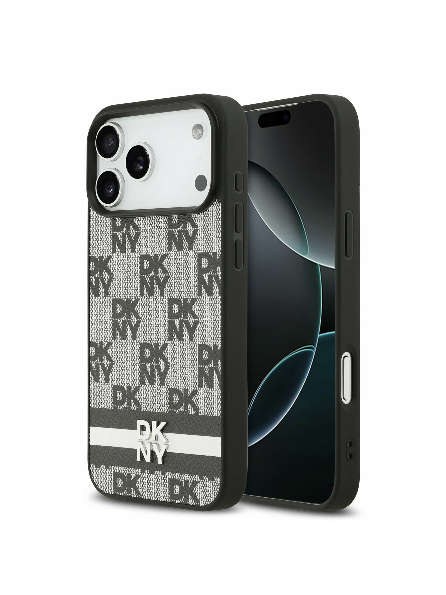 DKNY PU Leather Checkered Pattern and Stripe Заден Калъф за iPhone 17 Pro Черен